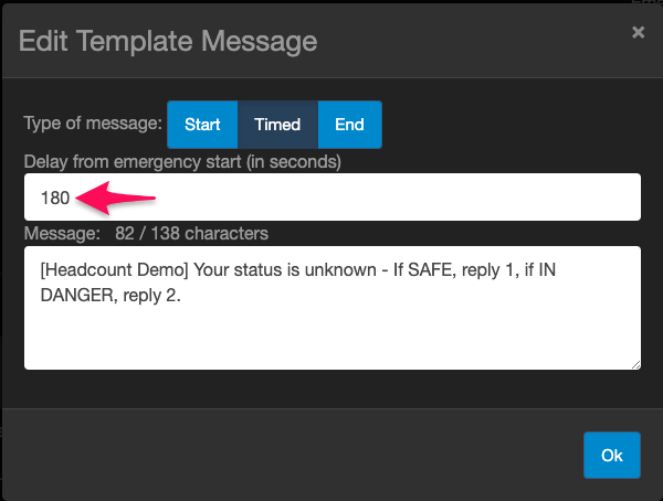 - Set to a time at least the average time it takes to clear the building - you don't want people looking at their phone or marking themselves safe before they are actually safe